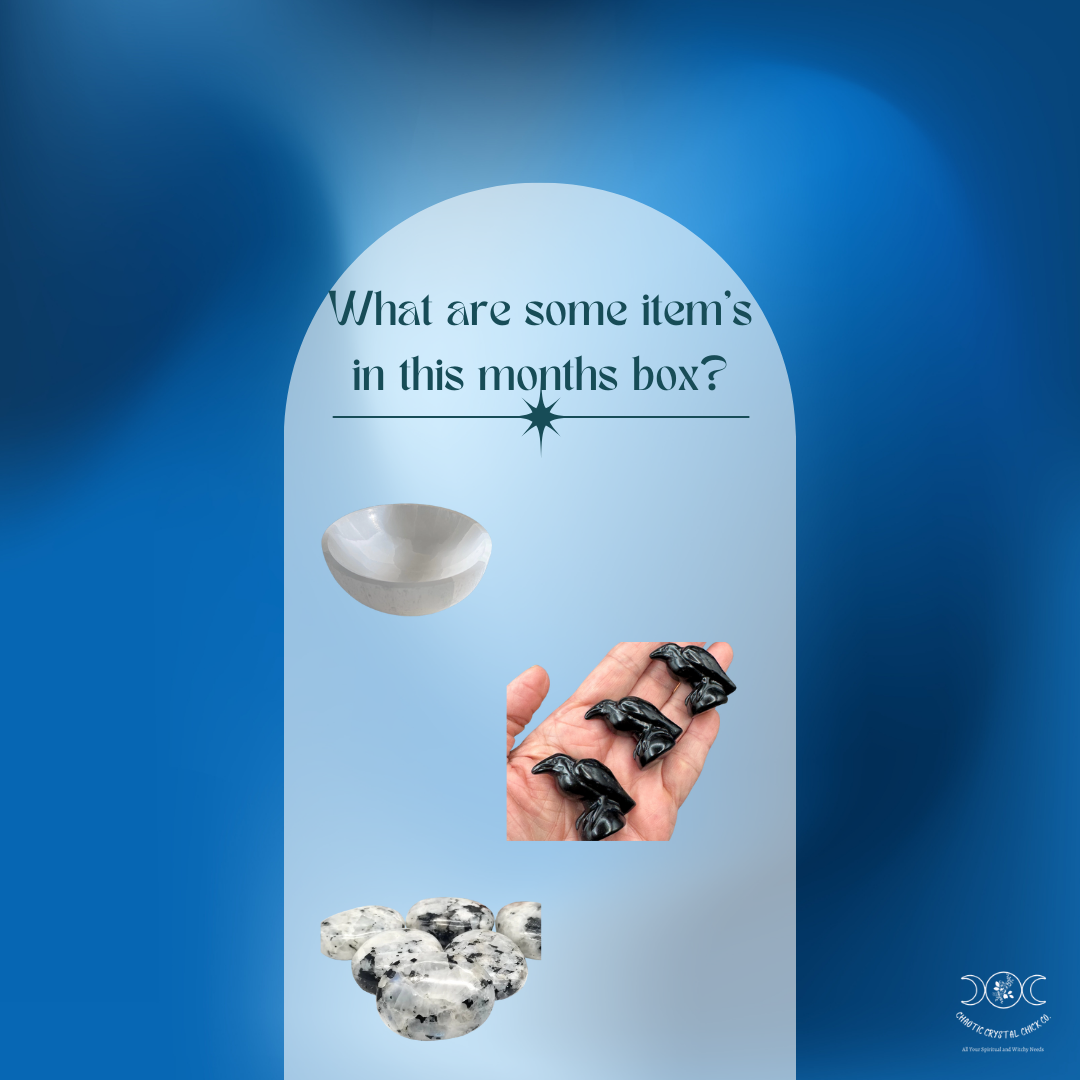 This month's box includes items such as: a selenite bowl, an obsidian crow shape, and a rainbow moonstone palmstone.