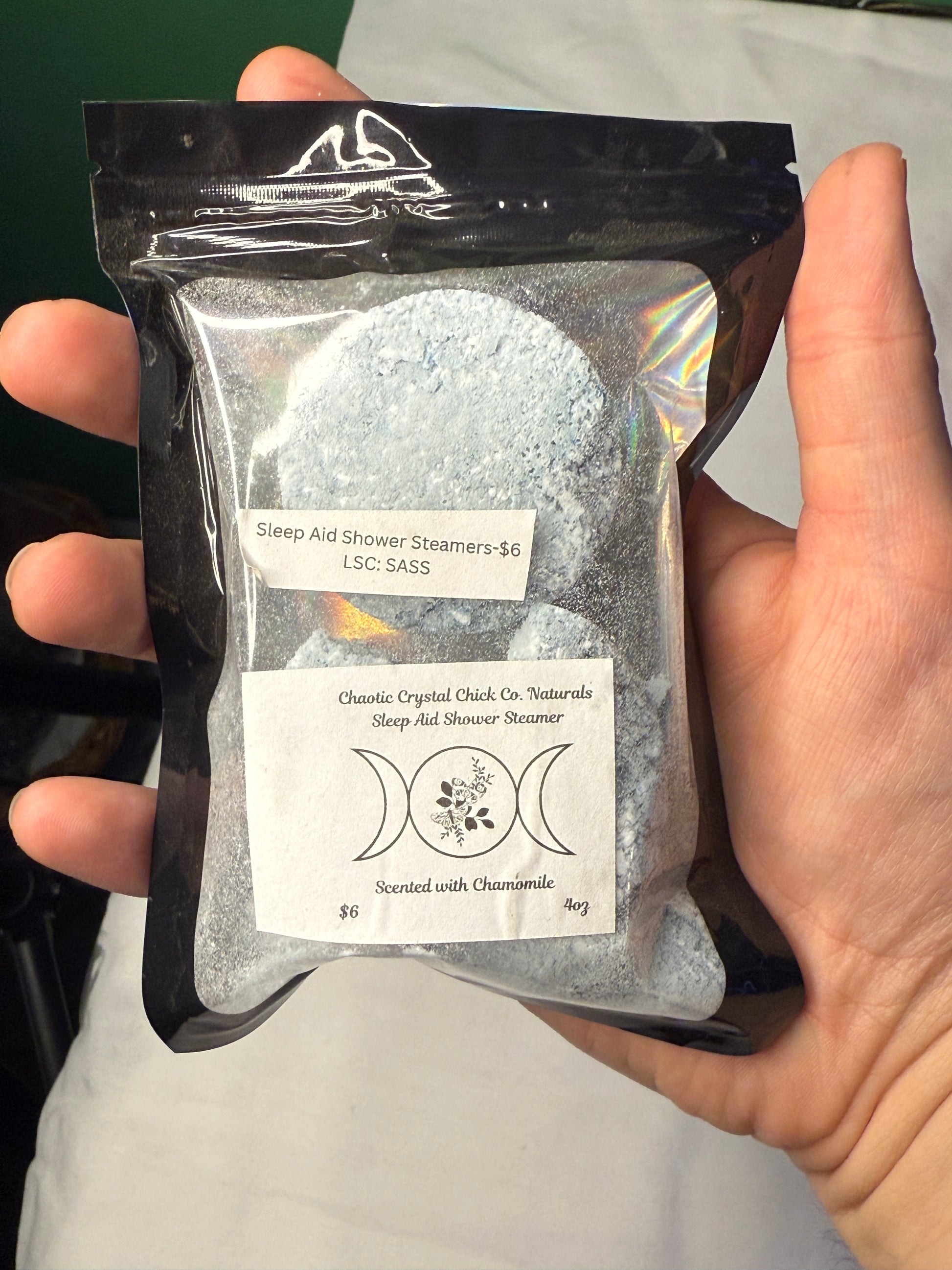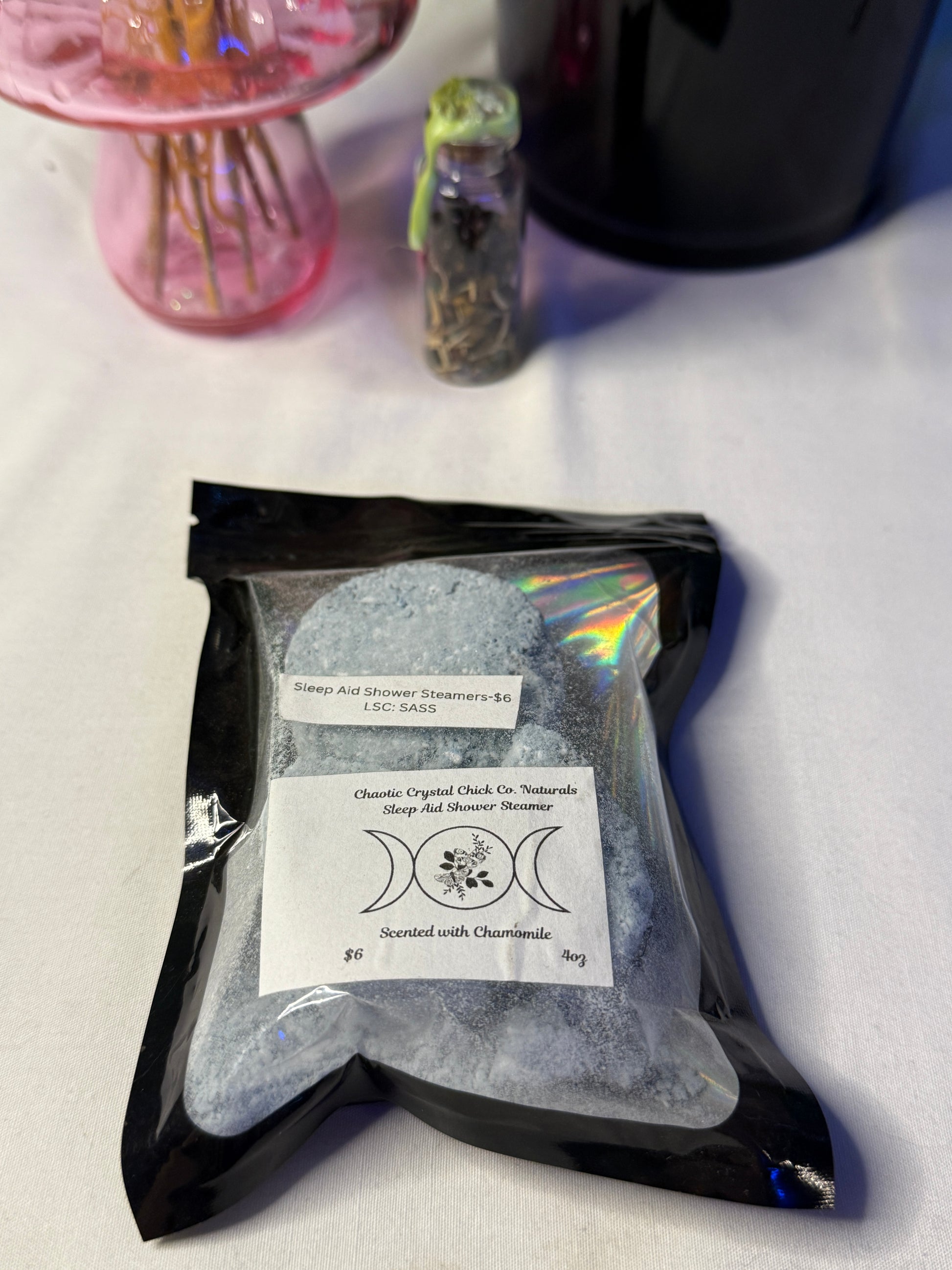 Our Medicinal Shower Steamers are created with baking soda, citric acid, epsom salts, and corn starch as a base and we use high quality essential oils to create aromatherapy environments that will aid you with your desired ailment.